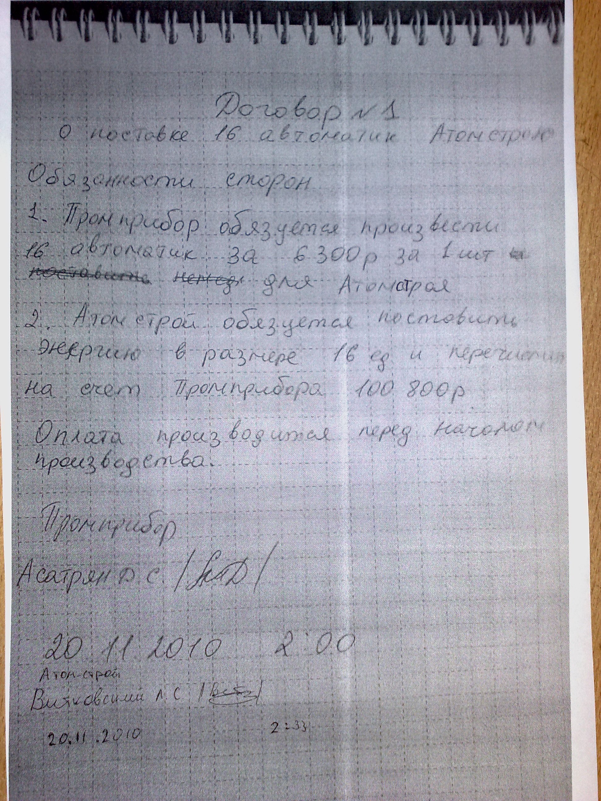 Договор между Атом-строем и ПромприборомИз: Договора Договор между Атом-строем и Промприбором. Обязанности сторон. 1. Промприбор обязуется произвести 16 автоматик по 6300 за 1 шт для Атом-строя. 2. Атом-строй обязуется поставить энергию в размере 16 ед и перечислить на счёт Промприбора 100800 рублей. Оплата производится перед началом производства. Атомстрой. Управляющий Витковский Л.С.